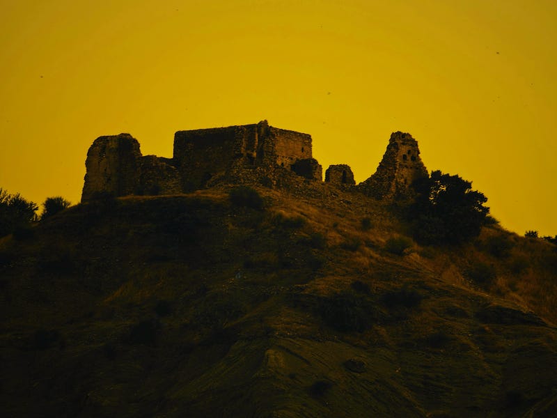 הקוצים היבשים התפצפצו מתחת לסוליותינו. ענני אבק זעירים עלו באוויר עם כל צעד. לאט נגלו אלינו מאחורי הגבעה אבני בזלת שחורות סדורות, מסמנות חלקות קטנות ונטושות. שרידי מבני אבן נמוכים, חסרי גג פזורים פה ושם, אקראית, צפופים יותר ככל שהוספנו לצעוד.